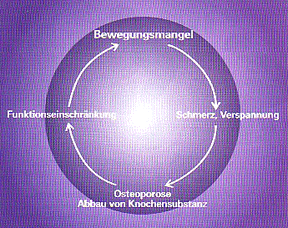 Definition: Osteoporose (Knochenschwund) ist die Abnahme der Knochenstabilität bedingt durch einen gesteigerten Knochenmassenverlust und Änderungen innerhalb der Knochenstruktur. Klinisch kommt es zum Knochenbruch ohne eine äußerlich erkennbare ursächliche Belastung oder Verletzung. Eine Verformung des Skeletts führt zur Fehlbelastung von Gelenken, zur Überbelastung der Muskulatur und der Sehnen. Fehlbelastete Gelenke, überlastete Muskulatur und Sehnenansätze sind schmerzhaft. Osteoporose erzeugt auf diesem Wege schmerzhafte Funktionseinschränkungen des Bewegungsapparates. Der Teufelskreis ist vorprogrammiert: |